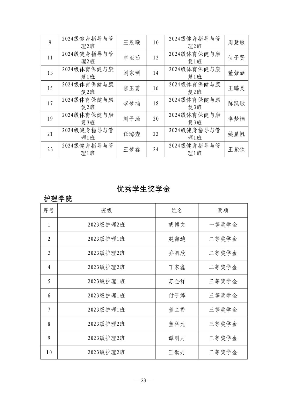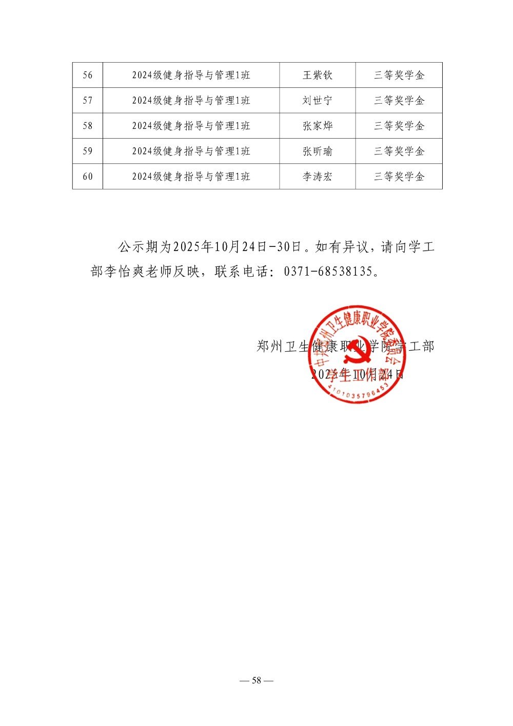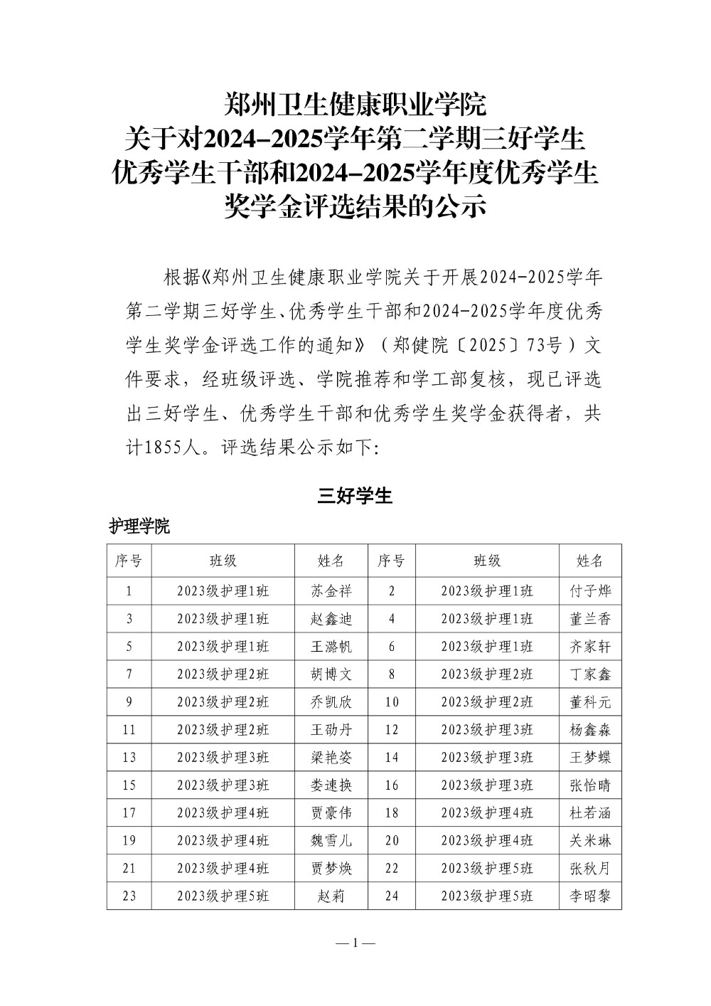 郑州卫生健康职业学院 2024-2025学年第二学期三好学生 优秀学生干部 优秀学生奖学金评选结果公示